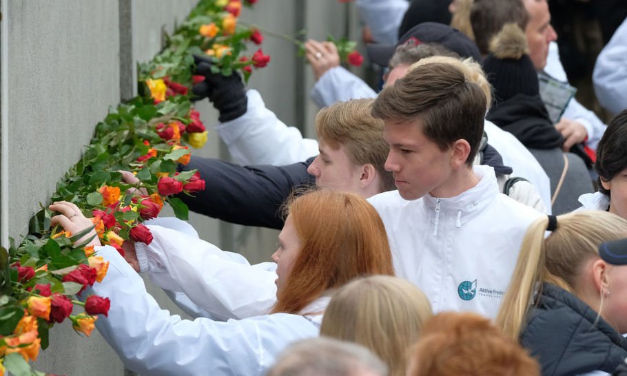 BERLIN, GERMANY - NOVEMBER 09: People stick flowers into slats of a still-standing portion of the Berlin Wall at Bernauer Strasse following a ceremony to celebrate the 30th anniversary of the fall of the Berlin Wall on November 9, 2019 in Berlin, Germany. From 1961 until 1989 the Berlin Wall, built by the communist authorities of East Germany to prevent people from East Berlin fleeing into West Berlin, divided the city. Its opening in 1989 quickly led to the collapse of the East German communist government and the eventual reunification of Germany in 1991. (Photo by Sean Gallup/Getty Images)