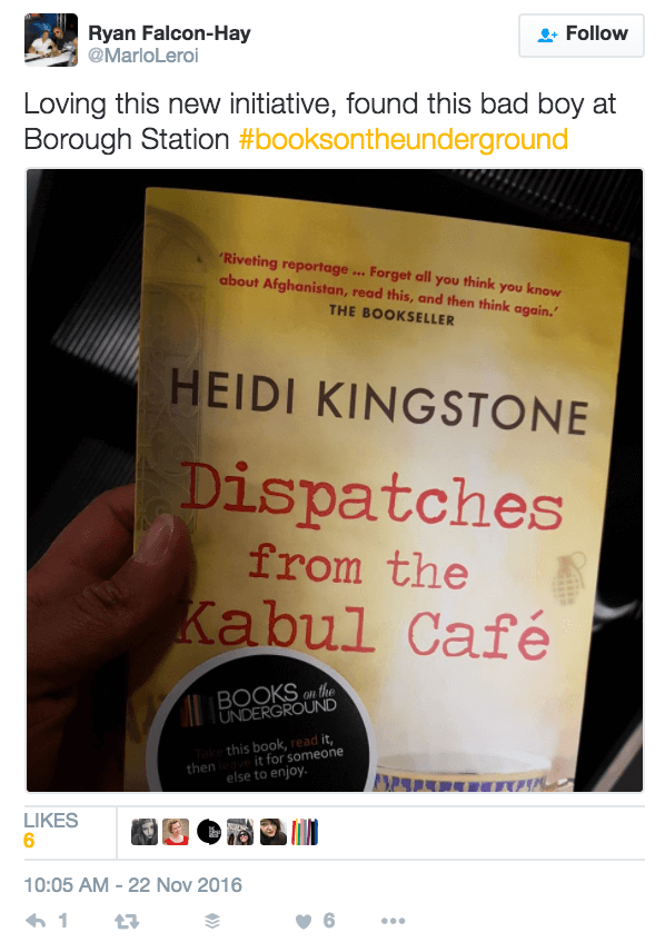 On 22nd November, the Books on the Underground team had a mammoth 100 copies of Heidi Kingstone’s Dispatches from the Kabul Cafe. We had fun with where to hide the books, and saw lots of engagement online from people who found them! It was such a delight to be involved with sharing this extraordinary book.