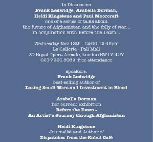 Continue readingOn the 12th November Heidi joins Frank Ledwidge, Arabella Dorman and Paul Moorcraft for a series of talks about Afghanistan and the folly of war. Attendance is free, and the event will take place at La Galleria, Pall Mall.