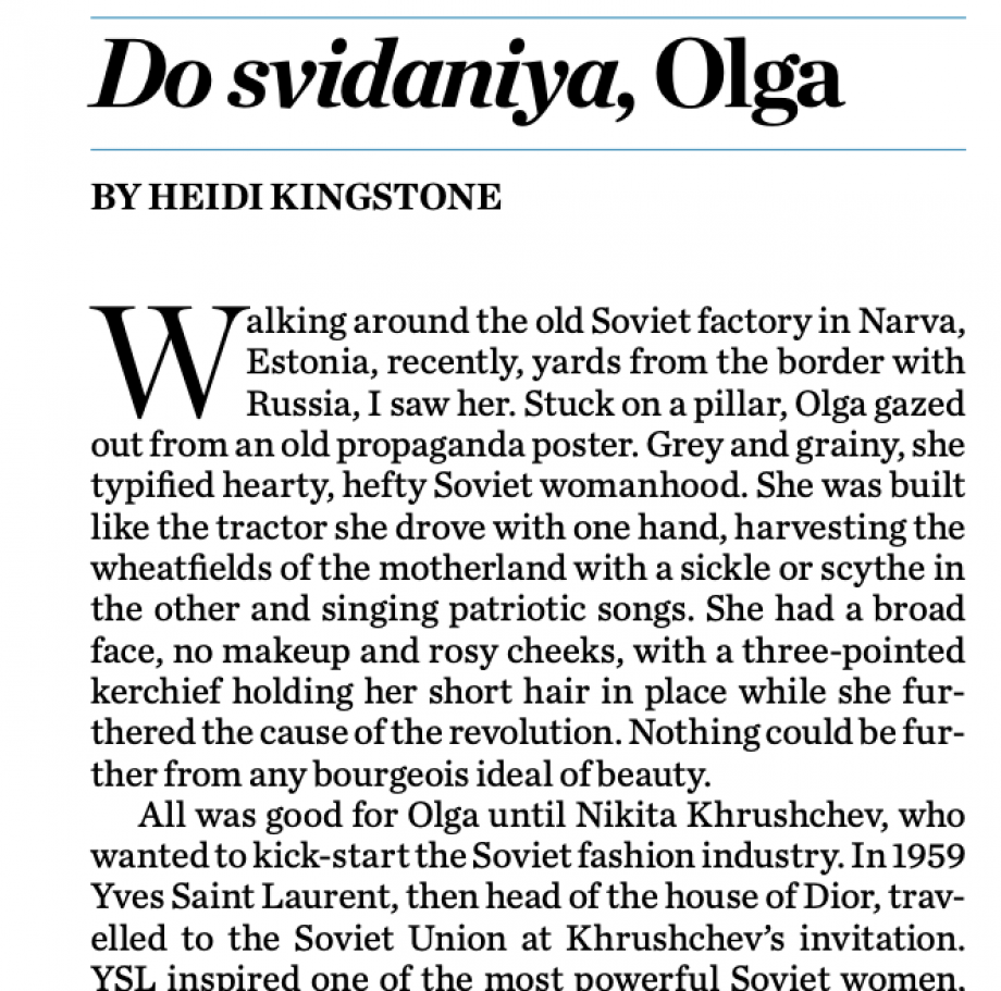 Olga made a comeback in the Brezhnev era, but then came Mikhail Gorbachev and his wife Raisa with her Western style. The final blow came in 1991 when the Soviet edifice crumbled. Like a nightmare version of living matryoshka dolls, out popped a never-ending phalanx of supermodels, each more gorgeous than the last. Where the hell did these women come from? And whatever happened to Olga? I am quite sure she did not marry an oligarch.